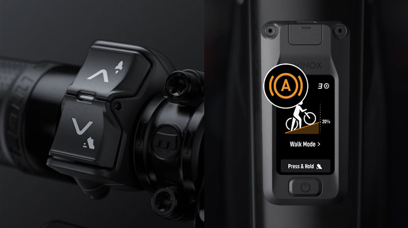 Avinox Drive System integra un’unità di misura inerziale (IMU) e un sensore di velocità delle ruote per offrire una assistenza alla camminata evoluta. Questa funzione permette di spingere la eBike con maggiore facilità anche su pendenze elevate o terreni irregolari. È sufficiente tenere premuto il pulsante con freccia verso il basso sul comando wireless sinistro, in qualsiasi modalità di guida, per attivare il supporto.
