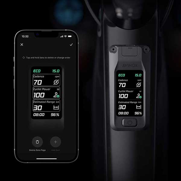 Attraverso l’app Avinox Ride è possibile personalizzare completamente le informazioni visualizzate sul display, includendo parametri come il tempo di percorrenza, distanza, velocità media, livello di assistenza, stato della batteria. Questa flessibilità consente a ogni rider di configurare il sistema in base alle proprie preferenze e al tipo di utilizzo.